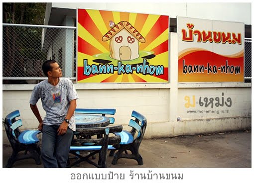 ร้านบ้านขนม ชื่อก็บอกชัดเจนอยู่แล้วว่า บ้านนี้ต้องขายขนมแน่นอน ร้านบ้านขนมทำธุรกิจค้าส่งขนม ที่มีผู้ผลิตอยู่ทั่วไป ตามภาคกลาง และต่างจังหวัด ทั้งขนมที่เป็นยี่ห้อและขนมที่มีผู้ผลิต นำมาเสนอขาย หรือไปสั่งทำตามโรงงาน บ้านเรือน ร้านเบเคอรี่ ที่สามารถผลิตขนมที่มีรูปลักษณ์ใหม่ แปลกตา และรสชาติอร่อย ถูกหลักอนามัย โดยทางร้านเองจะนำมา packing ใหม่ ในรูปแบบต่างๆ ซึ่งจะมีรูปแบบของ packet ใหม่ ๆออกมาอยู่เรื่อย ๆ เพื่อเอาใจผู้บริโภค มีทั้งแบบซองพลาสติก กล่องพลาสติก กล่องกระดาษ กระเช้าของขวัญ และกล่องไม้จักรสาน ขนมส่วนใหญ่ที่นำมา packing จะเป็นขนมจำพวกแยม ไพน์ ขนมเบเคอรี่ต่าง ๆ รวมไปถึงขนมเปี๊ยะ ที่จะขายในช่วงวันปีใหม่ หรือเทศกาลสำคัญ ๆ ร้านบ้านขนมมีที่ตั้งอยู่ที่ นิคมอุตสาหกรรมไฮเทค อ.วังน้อย จ.พระนครศรีอยุธยา เข้าประตูแรกเมื่อมาจาก กทม. ก็จะเห็นป้ายร้านสีสรรค์สะดุดตา ร้านบ้านขนมเองจะจัดบูทขายสินค้าที่ห้างสรรพสินค้าต่าง ๆ ในช่วงเทศกาล ของทุกปี โดยเฉพาะที่โลตัสอยุธยา ใครที่ผ่านไปผ่านมาช่วงเทศกาล สามารถแวะเวียนไปเลือกซื้อขนมไปเป็นของเฝ้าของฝาก แก่ปู่ย่าตายาย มิตรสหายได้ ราคาของ packet จะอยู่ที่ปริมาณของขนม และราคาวัสดุของบรรจุภัณฑ์ มีตั้งแต่ 20 30 บาท ไปจนถึงหลักพัน ที่เป็นกระเช้าใหญ่ มาต่อกันเรื่องของการออกแบบบ้างงานนี้ผมออกแบบมาตั้งแต่ โลโก้ร้าน ที่เป็นรูปบ้าน ที่ทำจากขนม จริงๆแล้วได้แรงบรรดาลใจมาจากการ์ตูนจากภาพยนต์ที่เคยดูตอนเด็ก ๆ ที่มีบ้านทำมาจากขนม ทำให้ตัวละครในเรื่องกัดแทะกินบ้านจนอิ่มหนำสำราญ ตัวบ้านเองจะเป็นขนมปัง มีหลังคาเป็นขนมปัง หน้าต่างเป็น คุ๊กกี้ และมีปล่องควันเป็นถ้วยขนม มันไม่ใช่ไอสครีม แต่เป็นขนมถ้วย ๆ ที่ผมเคยกิน ซึ่งจำไม่ได้แล้วว่าเขาเรียกชื่อว่าอะไร
