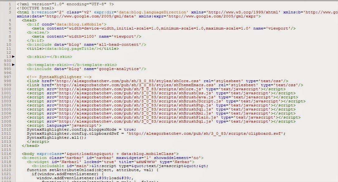 ทำมาหลายครั้งแล้วก็ลืม การเอา SyntaxHighlighter มาใส่ใน blogger ไม่ได้ยากเย็นอะไร เพียงแต่ต้องไปแก้ไขที่ตัว HTML มันเท่านั้น ซึ่งหากมีการเลือก theme ใหม่ หรือ เปลี่ยนรูปแบบ เราก็ต้องทำแบบนี้ทุกครั้ง เพราะ code ที่ใส่เข้าไปมันจะถูกล้างออกและทับด้วย template รูปแบบใหม่