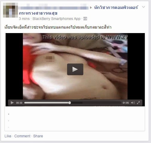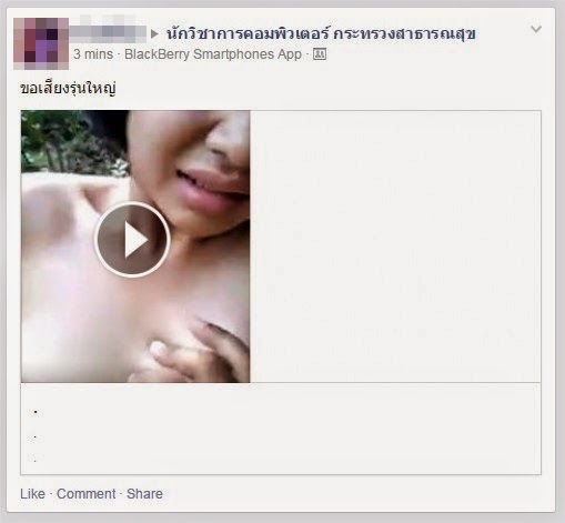 โดยผมเองก็ยังไม่รู้ที่มาที่ไปที่แน่ชัดว่า คนที่เขาถูกนำ facebook id ไปใช้นั้น ถูกโจรกรรมไปด้วยวิธีการไหน ซึ่งมีข้อสันนิษฐานว่า อาจจะเผลอไปกรอก email, password กับ “เว็บปลอม” ที่หลอกดักข้อมูลผู้ใช้ (phishing) หรือให้ผู้ใช้งาน submit app เป้าหมาย เพื่อขอ permission เอามาใช้งานได้ (หรือมี app ที่แอบดักข้อมูลบนมือถือ อันนี้ยากหน่อย แต่ผมเชื่อว่าทำได้) *ร้ายที่สุดคือมันเอา token key เราไปใช้ แต่ไม่น่าเป็นไปได้ ซึ่งตัวอย่างของยุคแรกนั้น ค่อนข้างโจ่งแจ้งและก่อผลเสียให้กับผู้ที่ถูก “ลักลอบ” นำไอดีไปใช้อย่างมาก เนื่องจากมันจะโพส “ภาพโป๊” ที่ลวงว่าเป็น “คลิปสยิว” ตามภาพด้านล่าง
