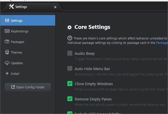 ต่อกันด้วยเรื่องของ Package ของ ATOM ซึ่งก็ไม่ต่างจาก sublime text เท่าไรนัก เท่าที่ทดสอบดู มันจะต่างกันตรง feature บางอย่างใน atom ไม่มี และบางอย่างก็ต้องอาศัยการตั้งค่าเยอะหน่อย แต่ถือว่าพอรับได้ ซึ่งตรงส่วนของ setting นี่ผมชอบเป็นพิเศษเลยเพราะว่ามันเป็น UI ไม่ใช่แบบ json เหมือน sublime text แต่ของ atom เขาจะเรียกว่า cson ซึ่งนามสกุลไฟล์มันก็จะเป็น .cson นั่นเอง ซึ่งเราก็สามารถเลือกตั้งค่าได้ทั้งแบบ UI และ cson ตามความถนัด