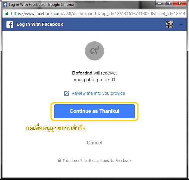 กด [continue as …] เพื่อให้สิทธิการเข้าถึงข้อมูล public ของ facebook แก่ dofordad.com